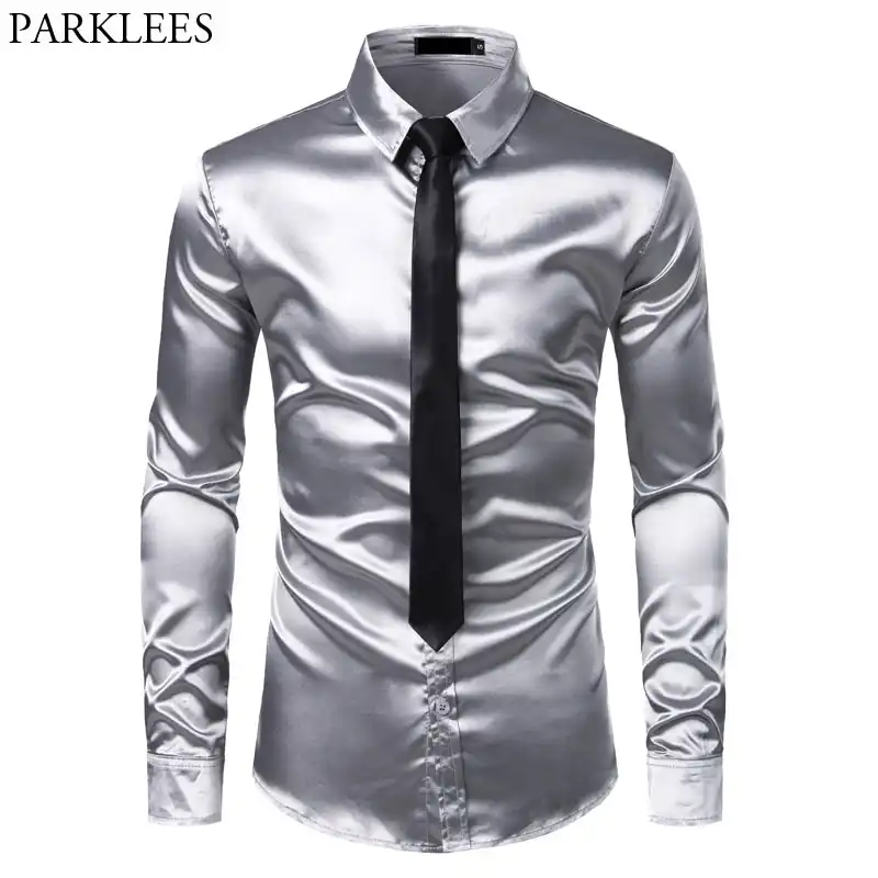Camisa de seda plateada de 2 uds + corbata para hombre, camisas de esmoquin satinado suave, camisas de hombre de seda
